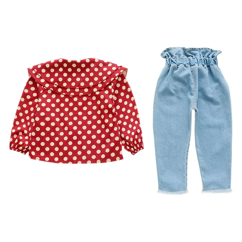 Best Price of Baby Girls Clothes New Autumn Polk Dot 2pcs Children's Shirts Leisure Jeans Suit Toddler Girl Tide